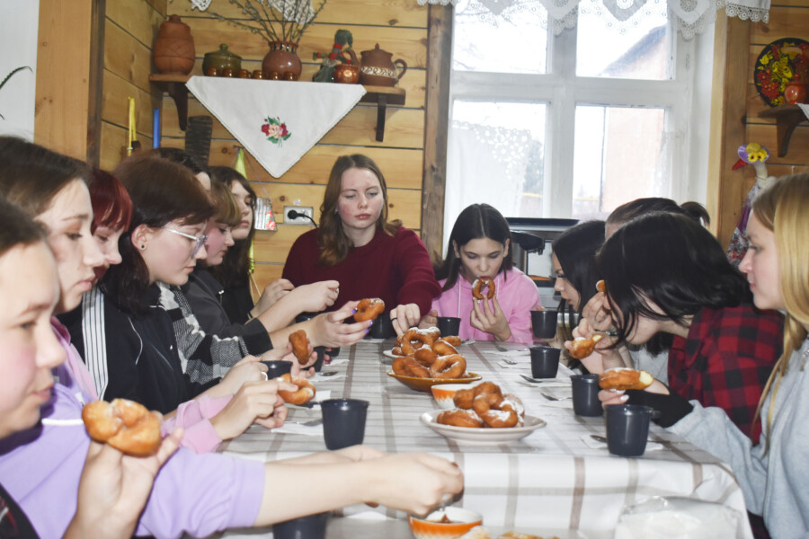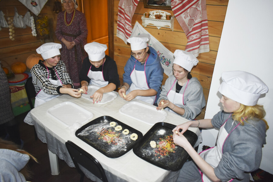 специальности «Дошкольное образование» прошел по-настоящему душевный и ароматный мастер-класс. Ребята, впервые переступившие порог Центра традиционной культуры «Радовесть», были искренне восхищены атмосферой, царящей в уютной «Крестьянской избе». Старинная мебель, вышитые рушники, самовар – всё это создавало ощущение погружения в добрые традиции.Главным событием дня стало знакомство с искусством выпечки свадебных «вареных» калачей. Студенты с энтузиазмом взялись за работу с тестом, стараясь создать калачики с душой, и это было видно невооруженным глазом!После увлекательного процесса выпечки, когда аромат свежеиспеченных калачей наполнил всё вокруг, участники мастер-класса собрались за чаем. Теплое общение, обмен впечатлениями и, конечно же, дегустация собственноручно приготовленных угощений – всё это стало прекрасным завершением дня.Этот мастер-класс стал не только возможностью освоить старинный рецепт, но и ценным опытом для будущих педагогов. Ведь именно такие традиции, передаваемые из поколения в поколение, помогают формировать у детей чувство привязанности к своим корням, уважение к труду и умение создавать уют и тепло в доме. Мы уверены, что знания и эмоции, полученные сегодня, найдут свое отражение в их будущей профессиональной деятельности.